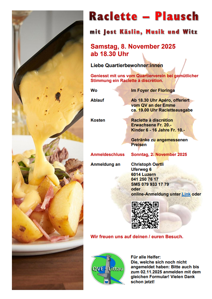 Aus organisatorischen Günden bitten wir um eine Anmeldung über unsere Webseite www.qve-littau.ch (Anmeldelink) oder unter Telefon 079 933 17 79 (Christoph Oertli), ebenso mit SMS oder WhatsApp. Bitte Personenanzahl angeben.