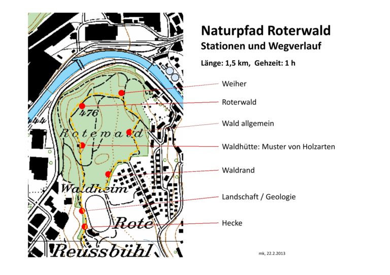 Verschiedene Tafeln entlang eines Rundwegs informieren über interessante Aspekte des Roterwaldes: Landschaft, Geologie, Waldrand usw. Ausserdem sind ausgewählte Pflanzen mit kleinen Schildern bezeichnet, welche interessante Details zur Pflanze, ihrer Verwendung oder Herkunft erklären.