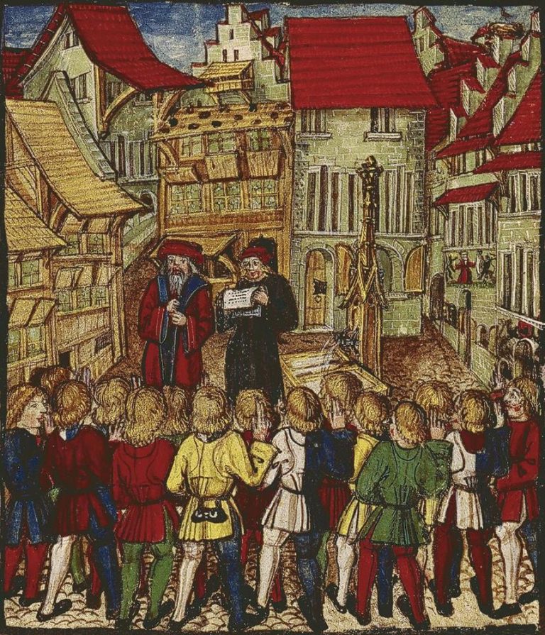 Der Schwur der drei Waldstätte und Luzerns am 13. November 1332. Darstellung aus Diebold Schillings „Luzerner Chronik“, 1513 (Zentral- und Hochschulbibliothek Luzern, Sondersammlung, Eigentum Korporation Luzern).