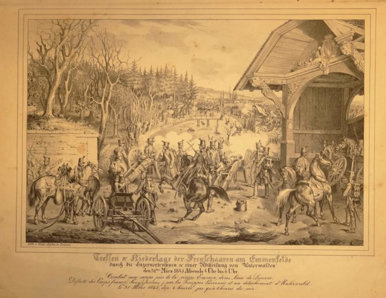 Lithografie eines Gefechts im Laufe des zweiten Freischarenzugs gegen Luzern. «Treffen & Niederlage der Freyschaaren am Emmenfelde durch die Luzernertruppen & einer Abtheilung von Unterwalden den 31. März 1845 Abends vier Uhr bis sechs Uhr» (Historisches Museum Obwalden Signatur G763b).