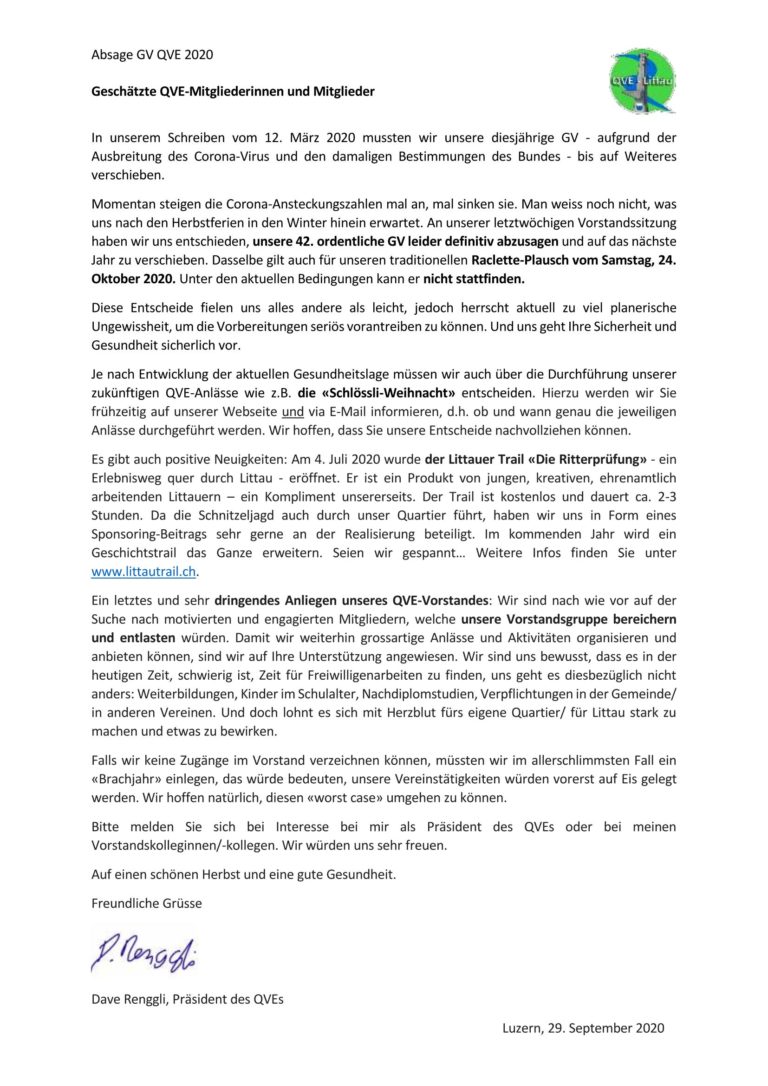 Veröffentlicht am 30. September 20206. Oktober 2020 von Webmaster-QVEInformationen zu unseren weiteren Anlässen, zur Generalversammlung und einen dringenden Aufruf des Vorstandes: